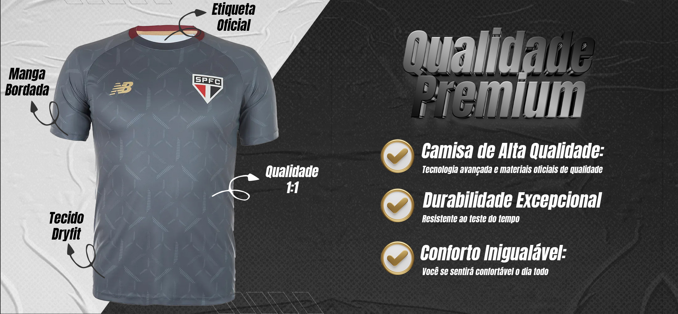Com design moderno na cor cinza, a camisa apresenta o escudo do São Paulo FC estampado no peito, demonstrando o orgulho de ser tricolor. A gola careca e as mangas curtas garantem liberdade de movimento e conforto, seja nos treinos ou em momentos casuais.